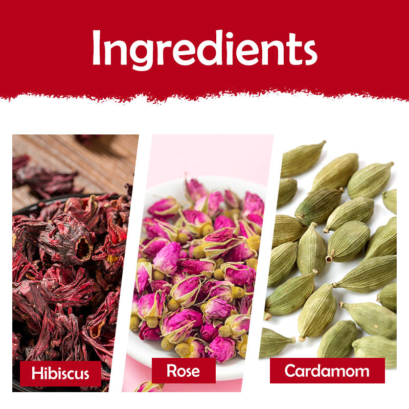 100% Natural hibiscus flower, rose and cardamom without any fillers and colors.